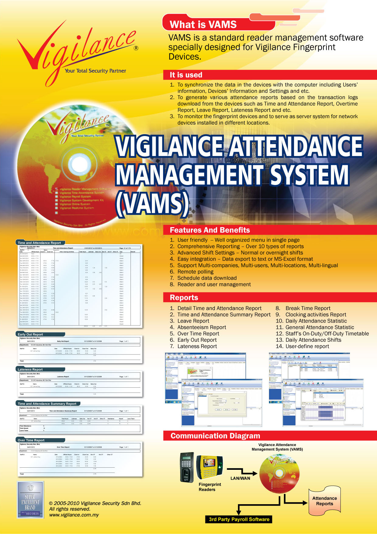 - Useful management exception reporting on attendance and lateness, useful tools for management to identify problems and take remedial actions.