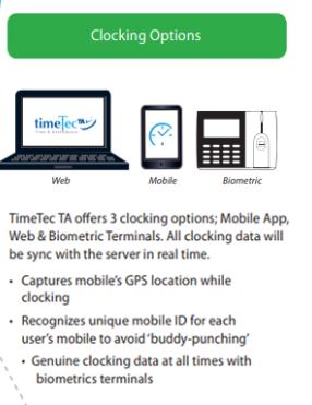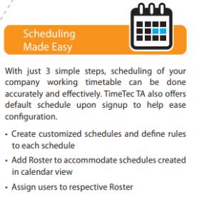 TimeTec TA is a cloud-based solution that brings workforce management to a whole new level. Data is now stored safely in the web allowing you the means of viewing the performances of your staff from anywhere, at anytime. With an Internet connection you will be able to login and gain access to features that will tackle any workforce issues such as monitoring and tracking staff’s attendance and whereabouts, create and manage effective scheduling by using multiple scheduling templates, and generate reports automatically.